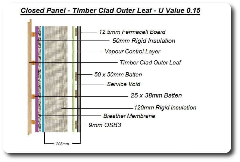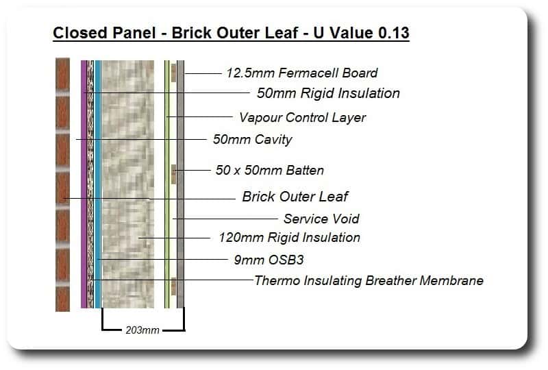 The images on the right show a 140mm frame filled with 120mm of rigid insulation and 50mm of rigid insulation in the cavity between the frame and the external cladding. With this structure we can achieve a U Value of 0.15 with external timber cladding and 0.13 with external brick.