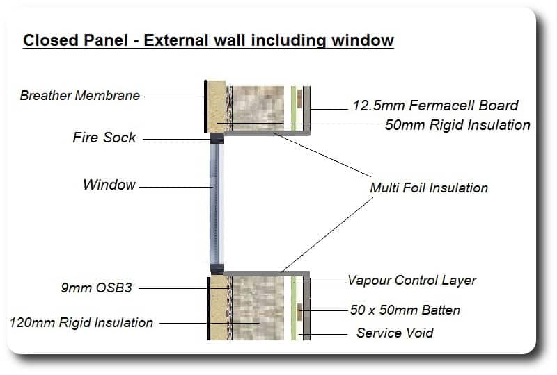 The windows should be installed within the timber frame & insulation layers to help eliminate thermal bridging. However, if windows are fitted to the external face then the window reveals need to have a layer of insulation fitted to further assist in reducing cold bridging. Multi Foil insulation is shown in the diagram on the bottom right. The fire sock around the windows also acts as a thermal insulator. Air sealant tape is applied around the windows for air tightness.